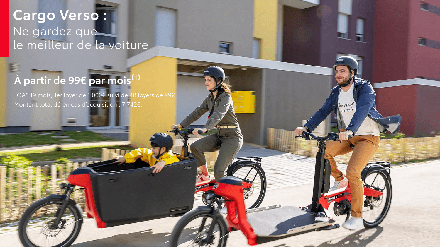 Modèle présenté : Toyota Vélo CARGO VERSO Caisse Wide Box et 2 sièges enfants neuf au prix de 7 185 €. LOA* 49 mois, 1er loyer de 1 000€ suivi de 48 loyers de 125 €/mois hors assurances facultatives. Option d'achat : 1990€ dans la limite de 49 mois & 20 000 km. Montant total dû en cas d'acquisition : 8 990 €. Assurance de personnes facultative à partir de 8,62 €/mois en sus de votre loyer, soit 422,38 € sur la durée totale du prêt.